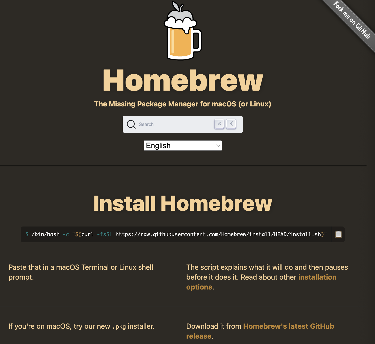 아래 사이트로 이동하여 Install Homebrew의 명령어를 복사한다.